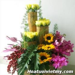- Bó hoa tươi trang trí bàn lễ với hoa hướng dương, hoa ly.